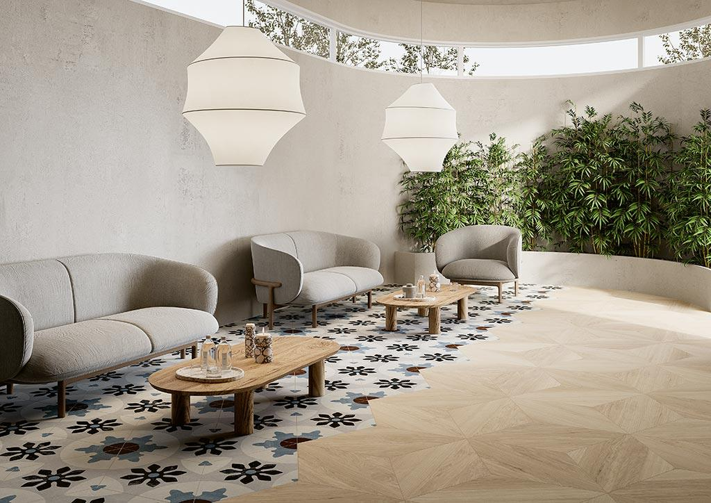 Das Hauptmerkmal dieser Kollektion ist die Einführung des neuen ROMBO-Formats, das einzeln oder in Kombination mit dem entsprechenden Chevron verlegt unzählige Möglichkeiten sowohl für einfarbige als auch für mehrfarbige Installationen bietet. BRIDGE bietet eine Serie von vier Arten von Feinsteinzeug in Holzoptik, begleitet von Dekorationen, die vom charakteristischen Cementine 20 inspiriert sind
