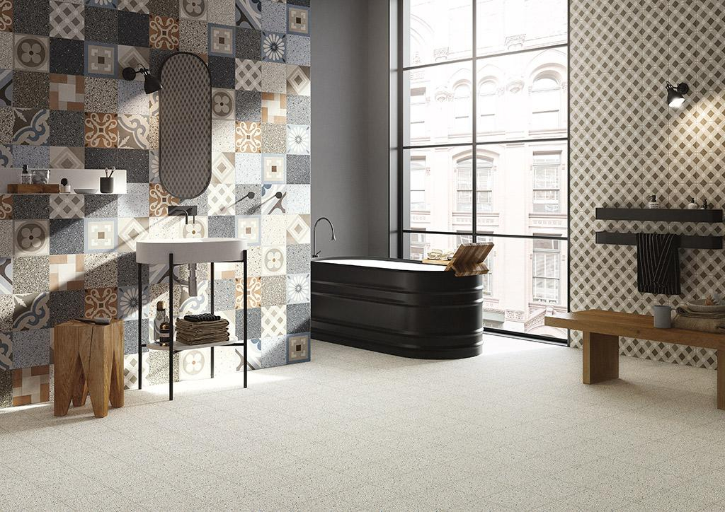 Inspiriert von traditionellen Zementleimfliesen, quadratisch oder sechseckig, deren vorherrschende Farben oft Grau- und Ziegeltöne waren.