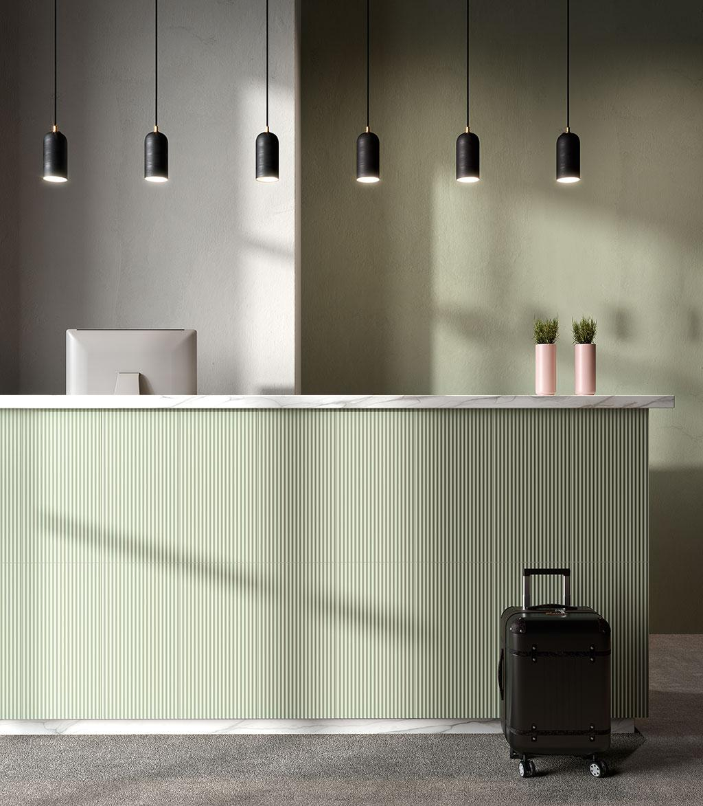 Die Kraft der Farbe. Durch den Einsatz volumetrischer Feinsteinzeug-Keramikplatten werden die Wände mit einzelnen Farbtönen gesättigt. Zwei Formen wurden in einer Skala gedämpfter Pastellfarben – zur Verwendung anstelle von Neutraltönen und Weiß – in einem matten Finish angeboten