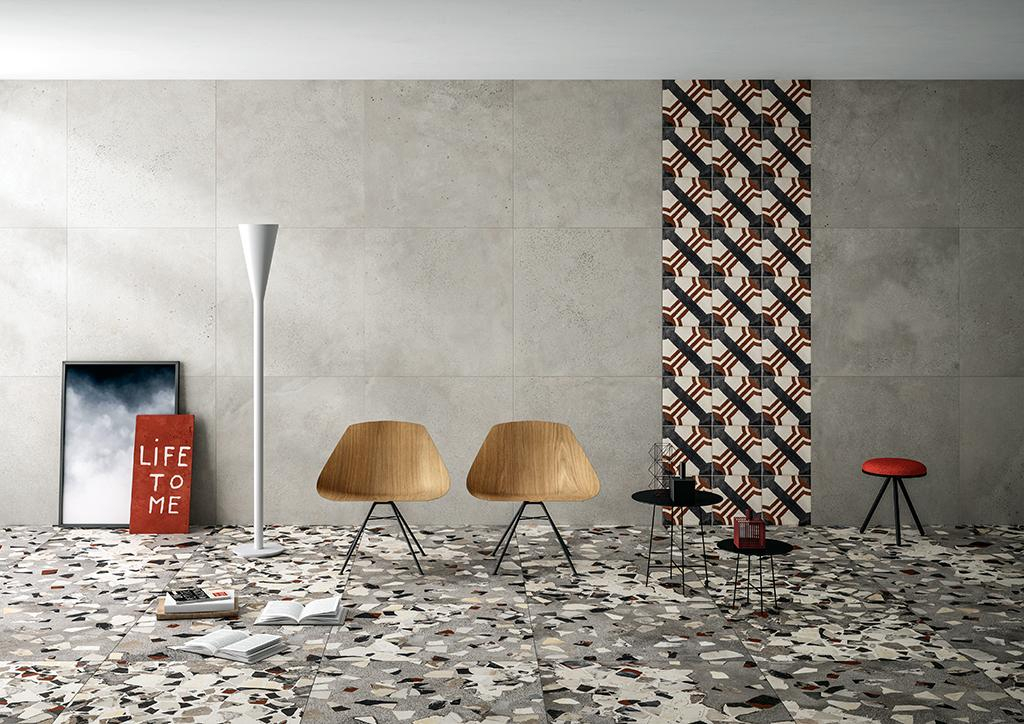 Die Inspiration ist ein recycelter Boden aus einem alten Bauernhaus in der Romagna. Wir befinden uns am Anfang des 20. Jahrhunderts, als Zement als Bindemittel bei Renovierungen eingesetzt wurde. Aber in die Böden sind Marmorstücke oder recycelte Materialien eingelegt.