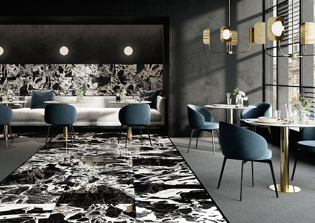 Das Feinsteinzeug mit Marmoreffekt von Prestige wurde entwickelt, um helle und dunkle Farbpaare, sowohl warme als auch kalte, anzubieten. Die aneinandergereihten Flächen erzeugen angenehme Kontraste, können aber auch einzeln genutzt werden.