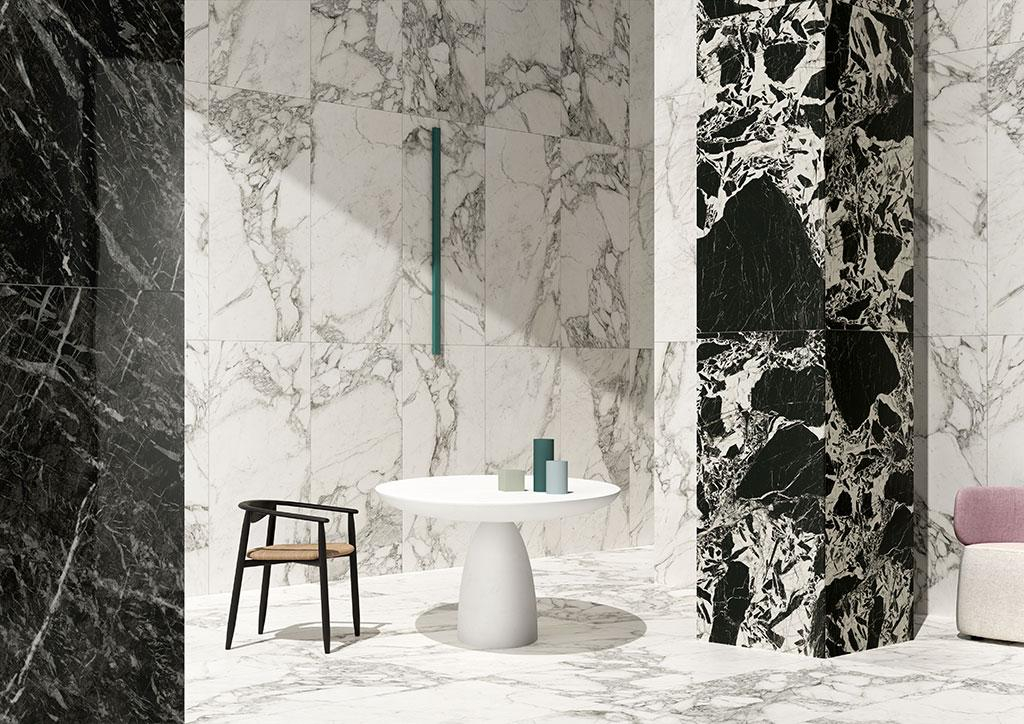 Das Feinsteinzeug mit Marmoreffekt von Prestige wurde entwickelt, um helle und dunkle Farbpaare, sowohl warme als auch kalte, anzubieten. Die aneinandergereihten Flächen erzeugen angenehme Kontraste, können aber auch einzeln genutzt werden.