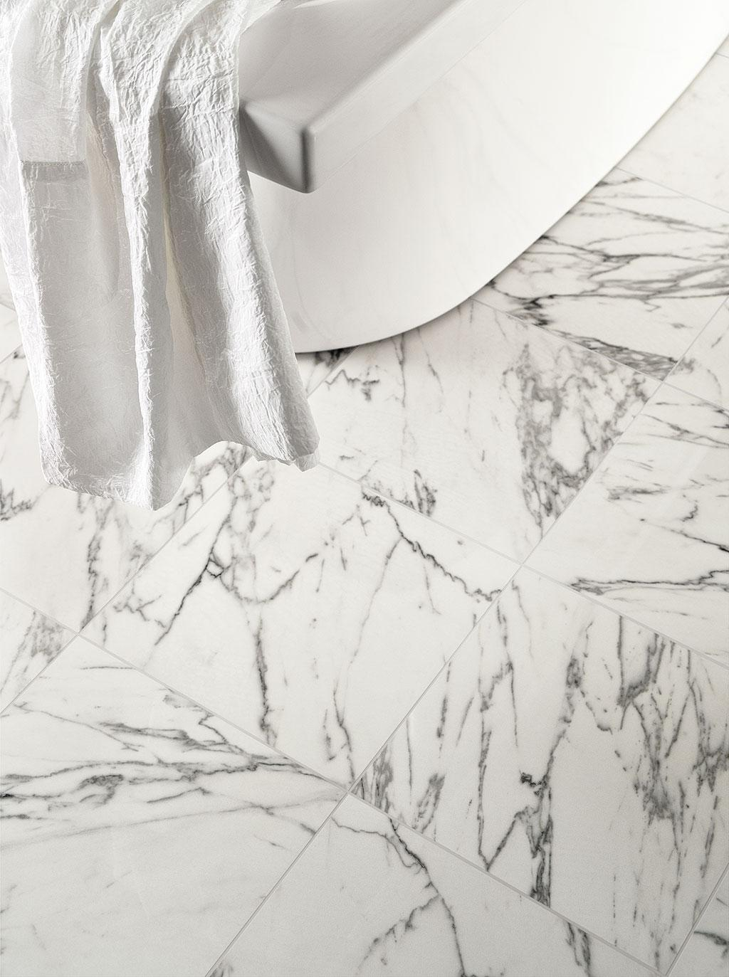 Das Feinsteinzeug mit Marmoreffekt von Prestige wurde entwickelt, um helle und dunkle Farbpaare, sowohl warme als auch kalte, anzubieten. Die aneinandergereihten Flächen erzeugen angenehme Kontraste, können aber auch einzeln genutzt werden.