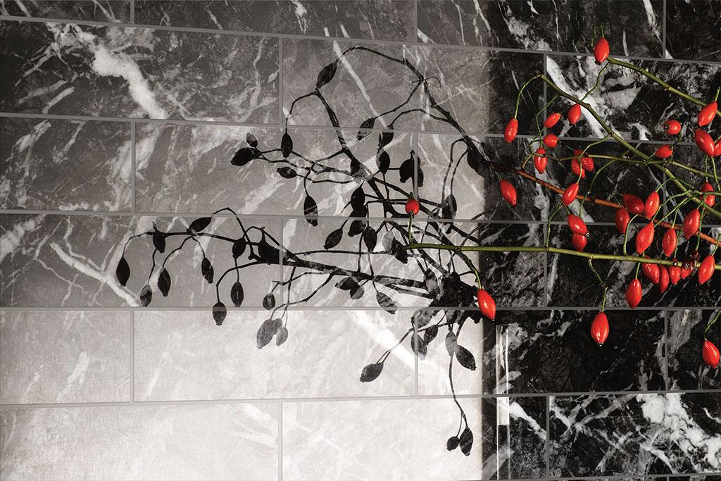 Das Feinsteinzeug mit Marmoreffekt von Prestige wurde entwickelt, um helle und dunkle Farbpaare, sowohl warme als auch kalte, anzubieten. Die aneinandergereihten Flächen erzeugen angenehme Kontraste, können aber auch einzeln genutzt werden.
