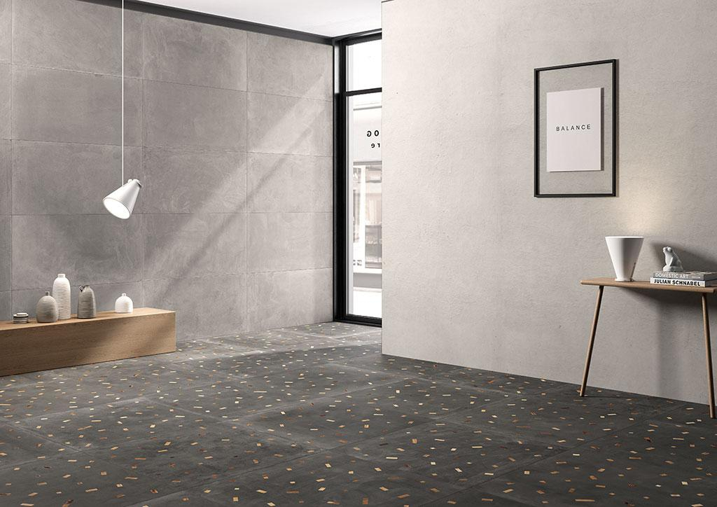 Zwei scheinbar weit entfernte Materialien finden ihre Balance zwischen Formen und Design und werden in Wohnkontexte mit einzigartigem und modernem Charme eingesetzt. Die Maserung des Holzes dringt in die Fliesen in Betonoptik ein und macht sie lebendig und zart.