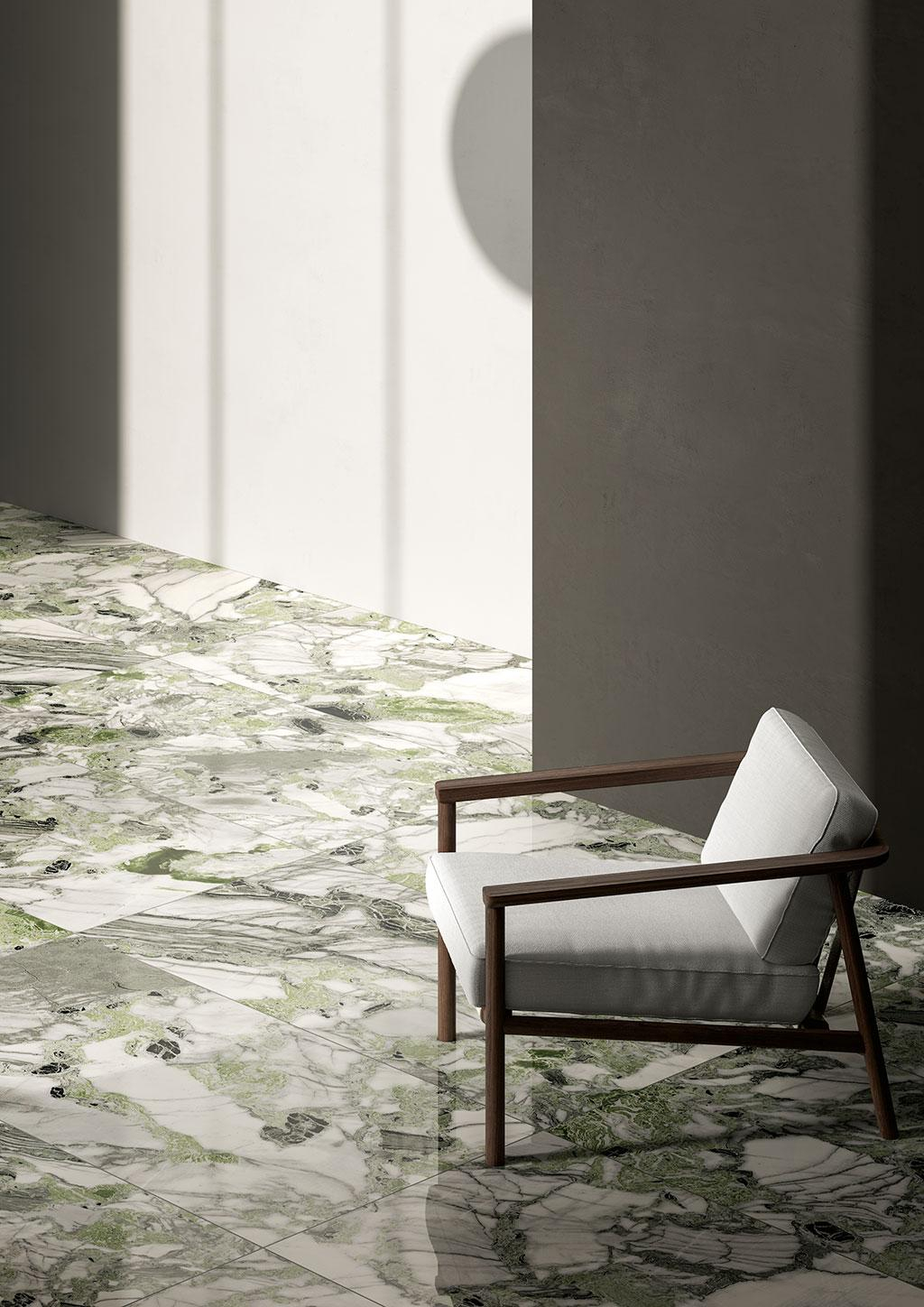 Fioranese denkt Marmor neu als ein Element, das in einem Spiel von Linien und Formen, neuen und originellen Farbkombinationen, die Wände und Räume bewegen, zerlegt, fragmentiert und rekonstruiert werden kann. Zusätzlich zu den klassischen Farben Weiß, Schwarz, Beige und Rosa bietet Fioranese ein intensives Grün für einen entschiedenen und starken Geschmack.
