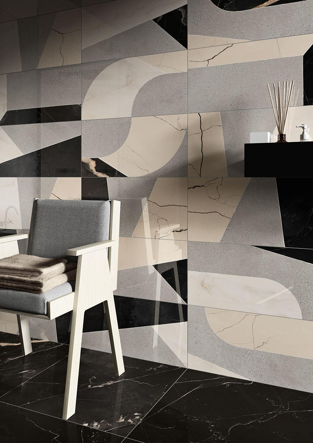 Fioranese denkt Marmor neu als ein Element, das in einem Spiel von Linien und Formen, neuen und originellen Farbkombinationen, die Wände und Räume bewegen, zerlegt, fragmentiert und rekonstruiert werden kann. Zusätzlich zu den klassischen Farben Weiß, Schwarz, Beige und Rosa bietet Fioranese ein intensives Grün für einen entschiedenen und starken Geschmack.