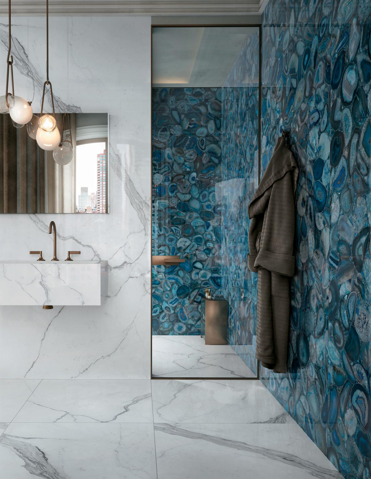 Eine Sammlung, in der jede Platte bewegt sich wie ein Kunstwerk. Erforschung der feinsten Marmore und deren Interpretation in Feinsteinzeug mit absoluter Aufmerksamkeit, um die Tiefe der Oberflächen, den Reichtum der Details und die Zufälligkeit der Maserungen wiederherzustellen.