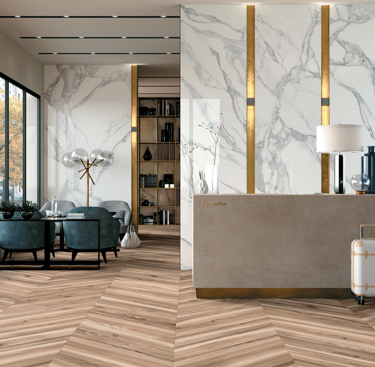 Der Charme des Natursteins, die Präzision der subtilen Maserungen, der Realismus der Farbnuancen, die intensive Harmonie der Töne kommen in einer exklusiven Kollektion kostbarer Marmore zum Ausdruck.