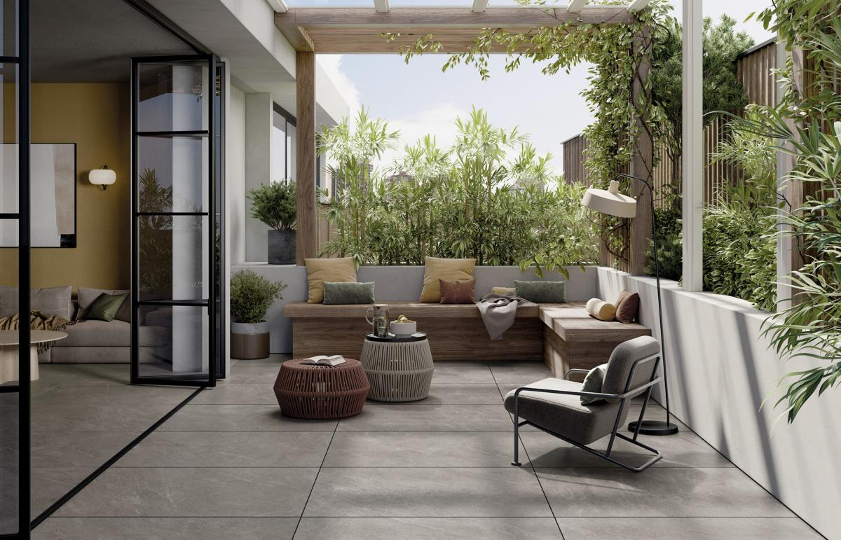 Die Kollektion entsteht aus der Mischung klassischer, durch Spaltung gewonnener Schieferplatten, die sich durch helle Maserungen und sanfte Farbtöne auszeichnen, mit Sedimentsteinen mit feiner Hintergrundkörnung und klareren Farbübergängen