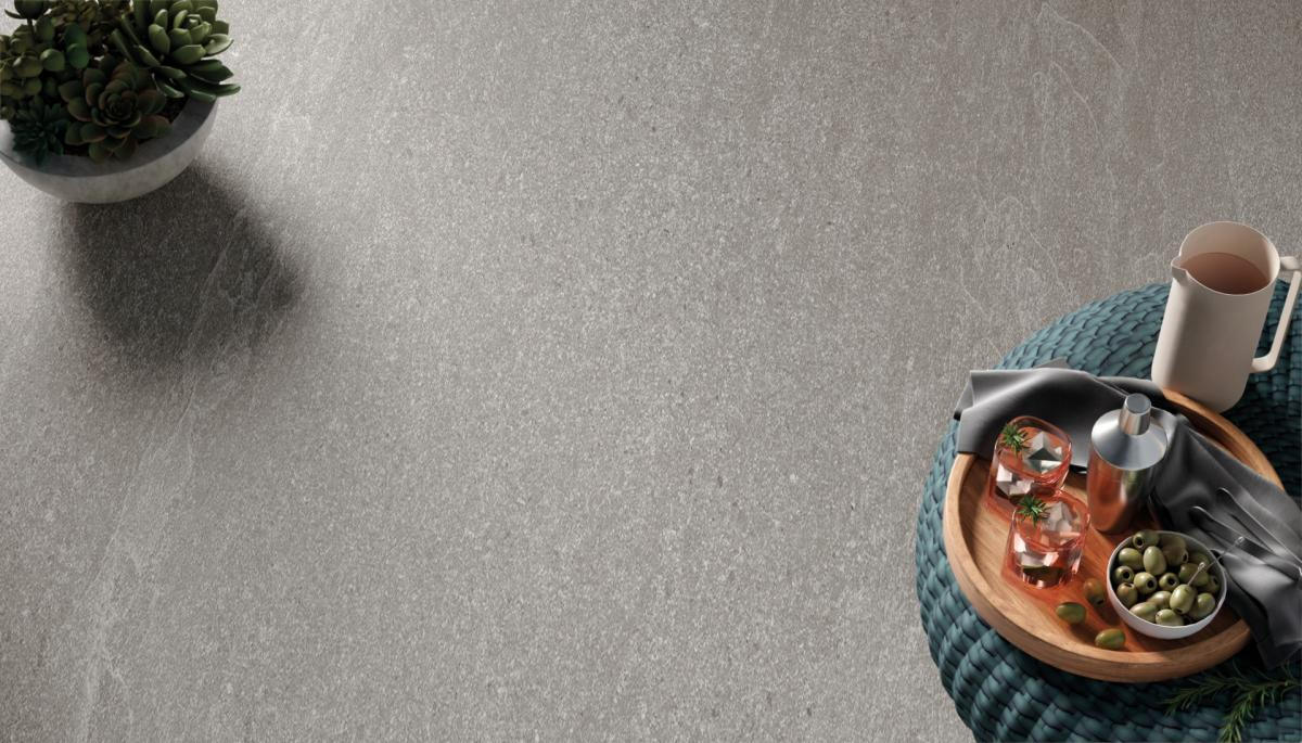 Die Kollektion entsteht aus der Mischung klassischer, durch Spaltung gewonnener Schieferplatten, die sich durch helle Maserungen und sanfte Farbtöne auszeichnen, mit Sedimentsteinen mit feiner Hintergrundkörnung und klareren Farbübergängen