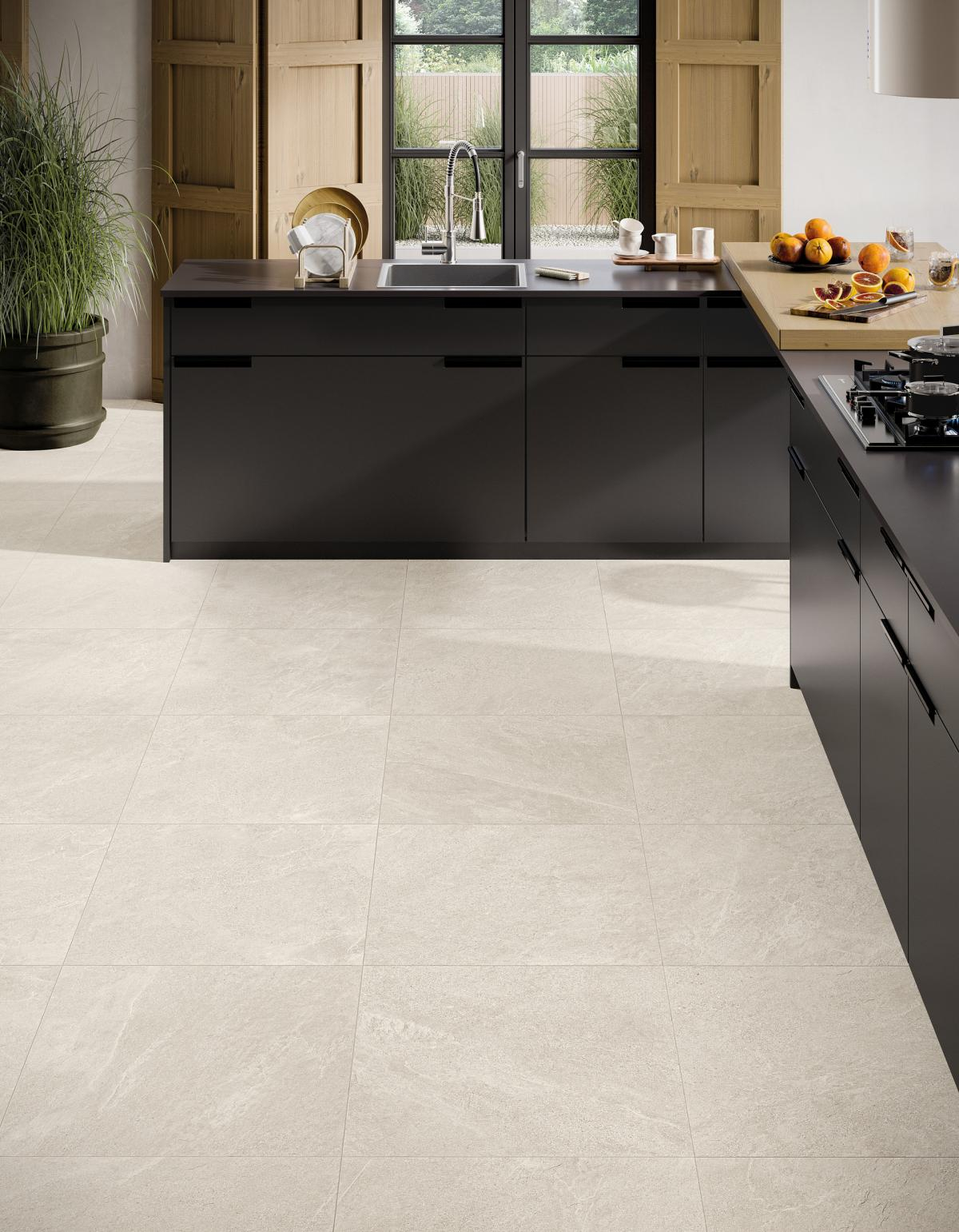 Die Kollektion entsteht aus der Mischung klassischer, durch Spaltung gewonnener Schieferplatten, die sich durch helle Maserungen und sanfte Farbtöne auszeichnen, mit Sedimentsteinen mit feiner Hintergrundkörnung und klareren Farbübergängen