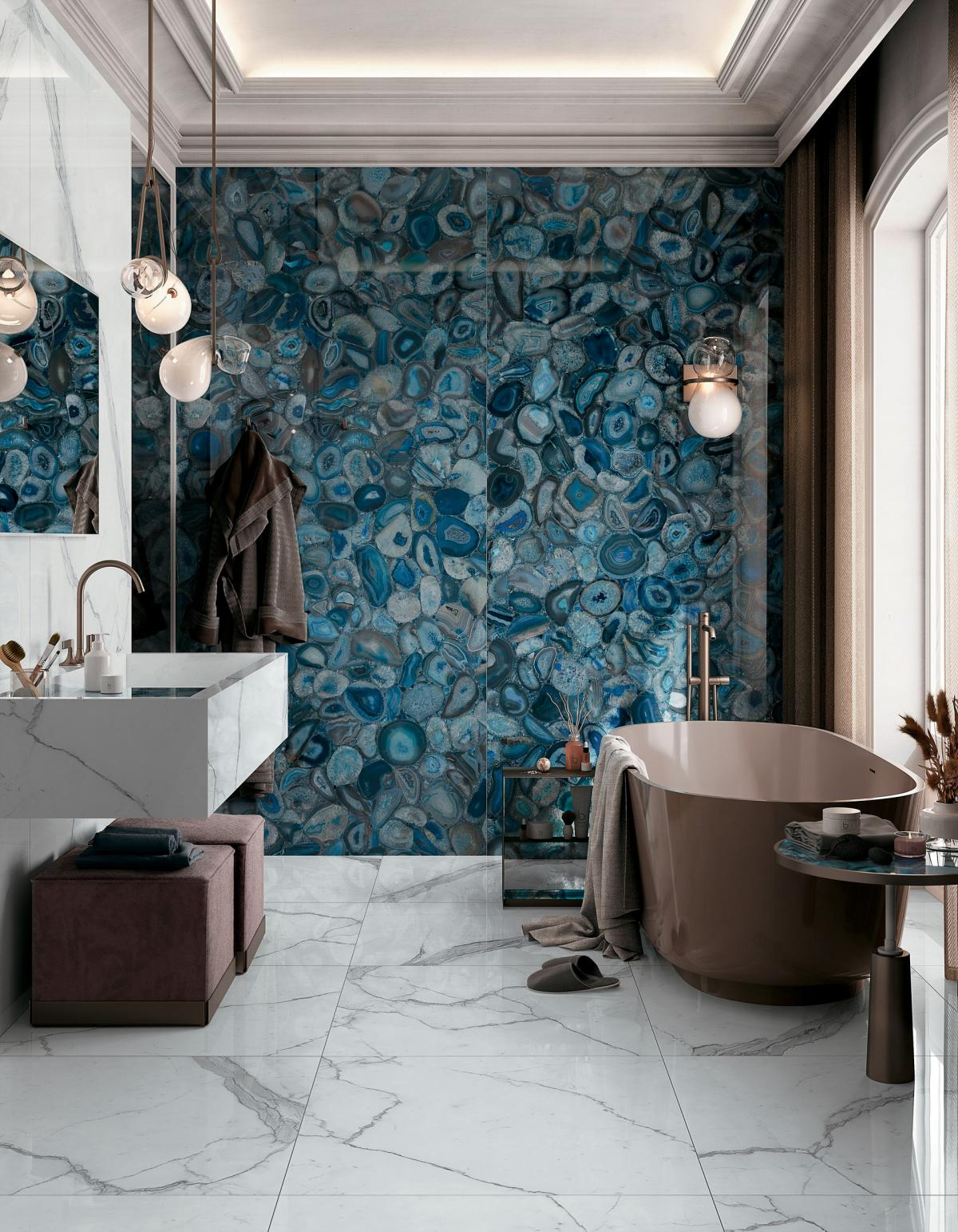 Pigmente und natürliche Rohstoffe von absoluter Exzellenz kennzeichnen Vorschläge, bei denen die chromatische Komplexität und Tiefe der dekorativen Muster bis ins kleinste Detail entwickelt und gepflegt wurde. Eine sorgfältige Arbeit für eine Feinsteinzeug-Neuinterpretation von 10 prestigeträchtigen Referenzen aus Naturmarmor und 3 eleganten agglomerierten Achaten