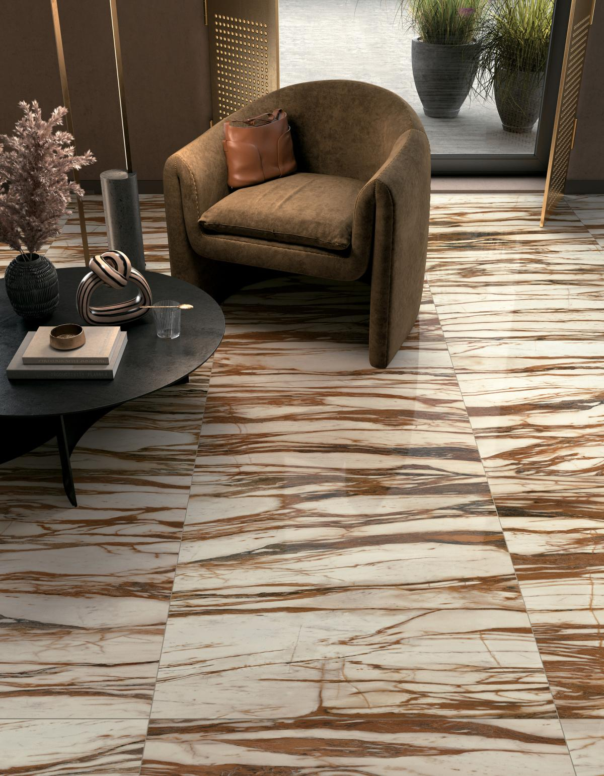 Pigmente und natürliche Rohstoffe von absoluter Exzellenz kennzeichnen Vorschläge, bei denen die chromatische Komplexität und Tiefe der dekorativen Muster bis ins kleinste Detail entwickelt und gepflegt wurde. Eine sorgfältige Arbeit für eine Feinsteinzeug-Neuinterpretation von 10 prestigeträchtigen Referenzen aus Naturmarmor und 3 eleganten agglomerierten Achaten