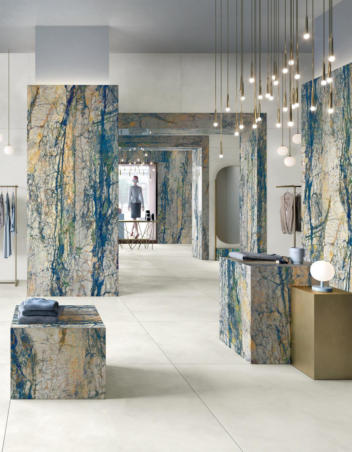 Pigmente und natürliche Rohstoffe von absoluter Exzellenz kennzeichnen Vorschläge, bei denen die chromatische Komplexität und Tiefe der dekorativen Muster bis ins kleinste Detail entwickelt und gepflegt wurde. Eine sorgfältige Arbeit für eine Feinsteinzeug-Neuinterpretation von 10 prestigeträchtigen Referenzen aus Naturmarmor und 3 eleganten agglomerierten Achaten