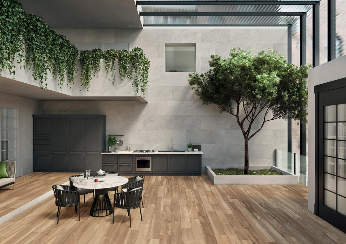 Wärme, Harmonie, natürliche Eleganz: Mit Hike lässt sich das Feinsteinzeug vom unwiderstehlichen Charme des Holzes erobern, um Räumen eine freundliche und positive Stimmung zu verleihen.
