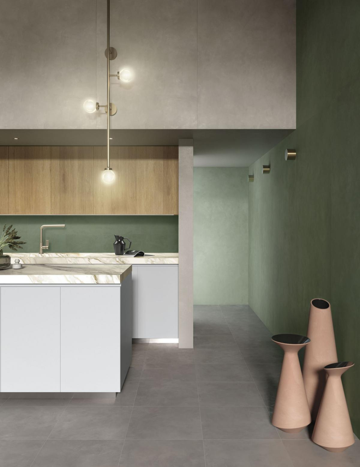 Die Designidee besteht darin, die Modernität von Beton und die Eleganz von Harz innerhalb desselben Produkts zu kombinieren. Eine Kollektion aus Feinsteinzeug von kostbarem Materialwert entsteht, mit weichen Oberflächen und vielseitiger Verwendung