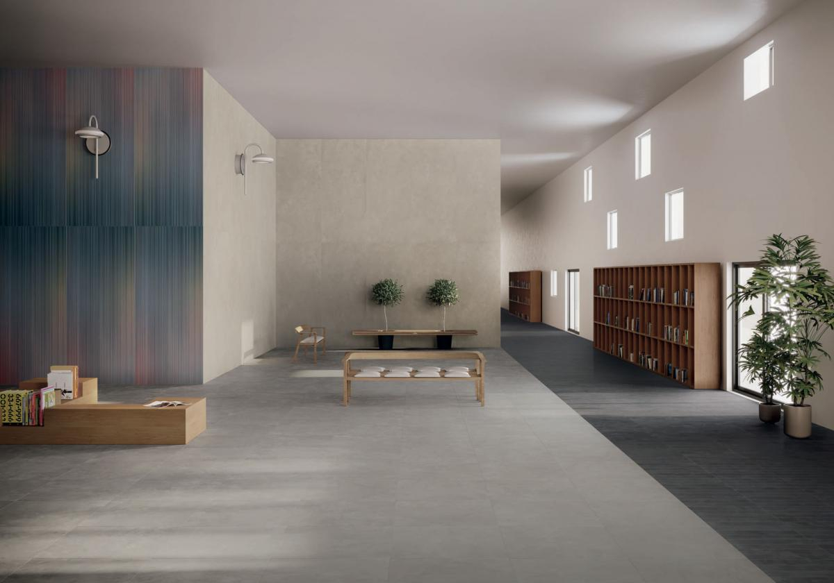 Die Designidee besteht darin, die Modernität von Beton und die Eleganz von Harz innerhalb desselben Produkts zu kombinieren. Eine Kollektion aus Feinsteinzeug von kostbarem Materialwert entsteht, mit weichen Oberflächen und vielseitiger Verwendung