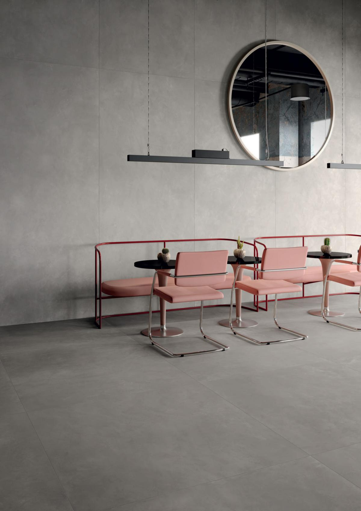 Die Designidee besteht darin, die Modernität von Beton und die Eleganz von Harz innerhalb desselben Produkts zu kombinieren. Eine Kollektion aus Feinsteinzeug von kostbarem Materialwert entsteht, mit weichen Oberflächen und vielseitiger Verwendung