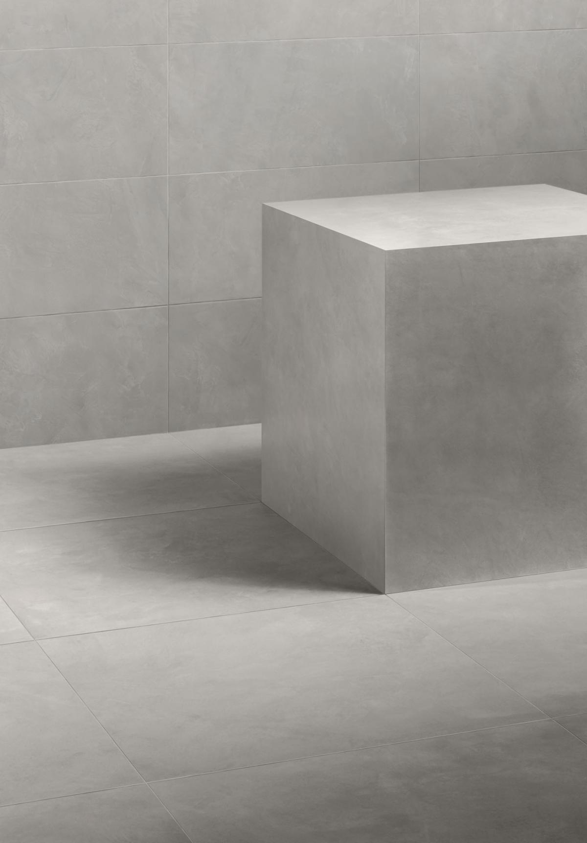 Die Designidee besteht darin, die Modernität von Beton und die Eleganz von Harz innerhalb desselben Produkts zu kombinieren. Eine Kollektion aus Feinsteinzeug von kostbarem Materialwert entsteht, mit weichen Oberflächen und vielseitiger Verwendung