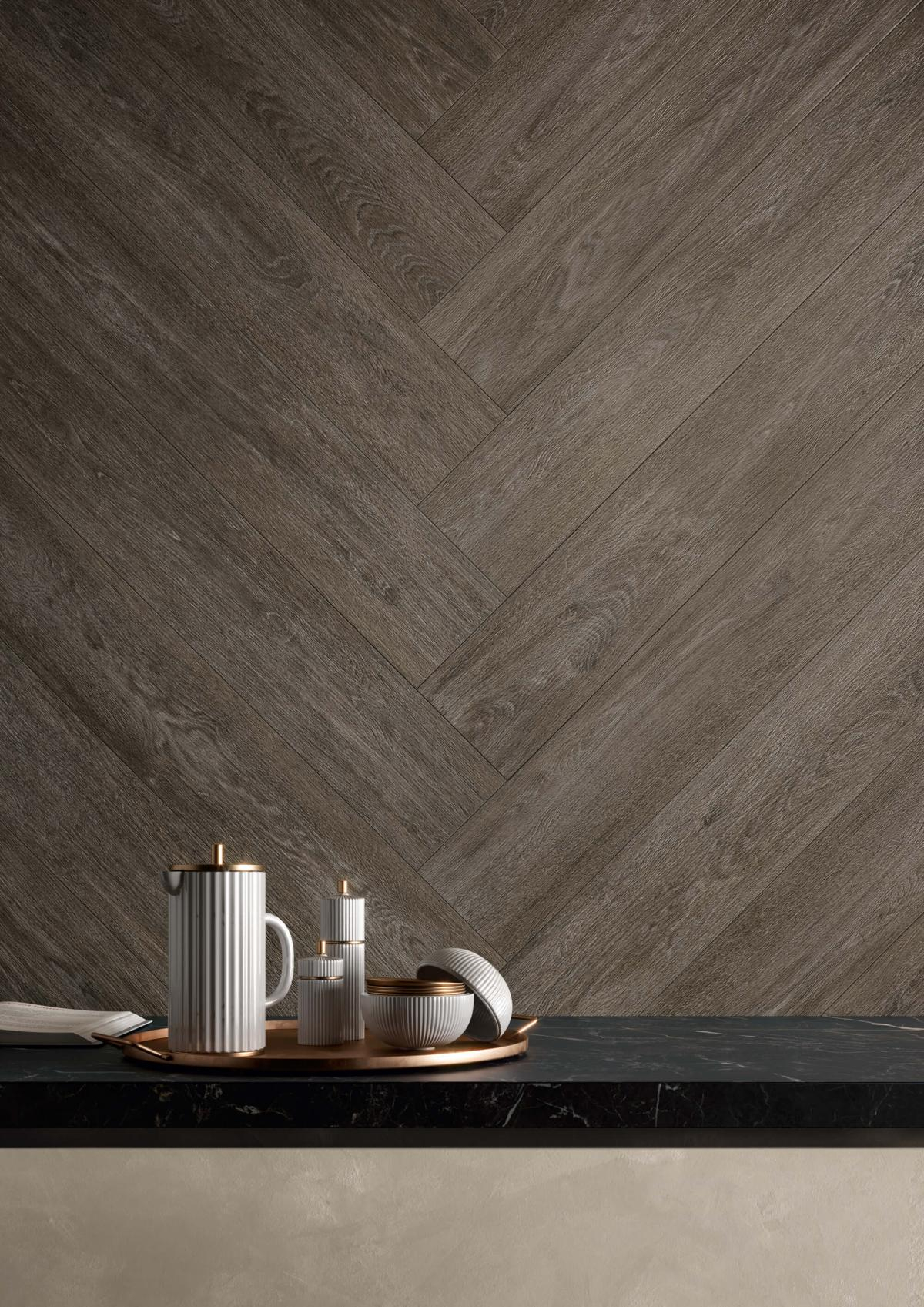 Eine eindrucksvolle Begegnung zwischen dem natürlichen Akzent der Inspirationsquelle und dem Geschmack des leicht abgenutzten Materials, das durch Beizen wiederhergestellt wird.