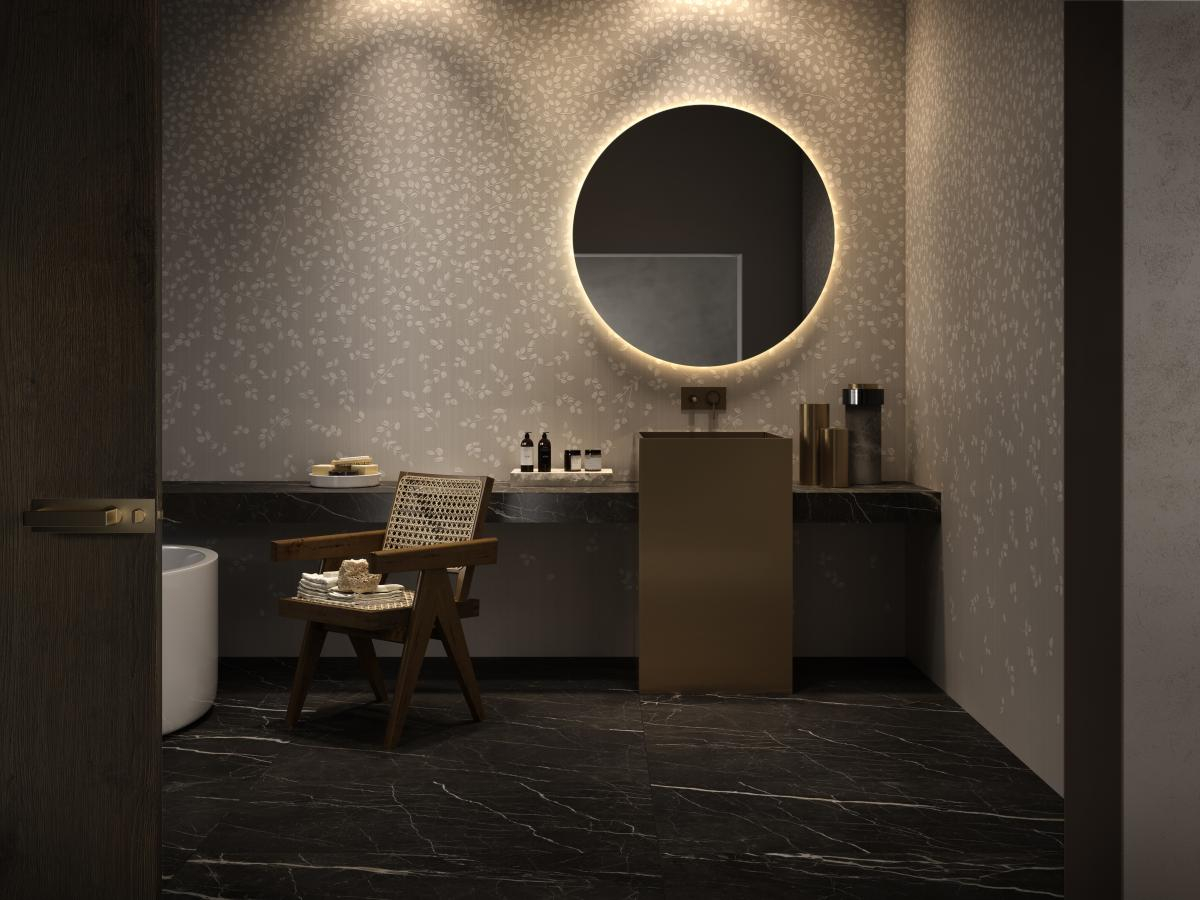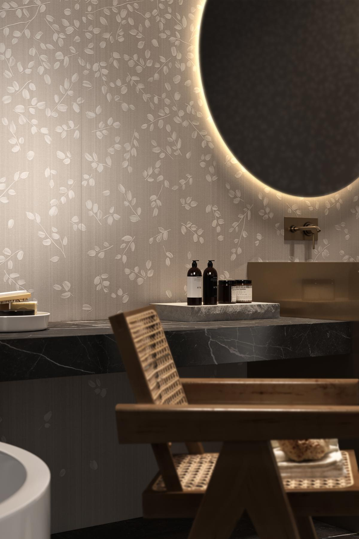- Material: Feinsteinzeug mit Tapeteneffekt
