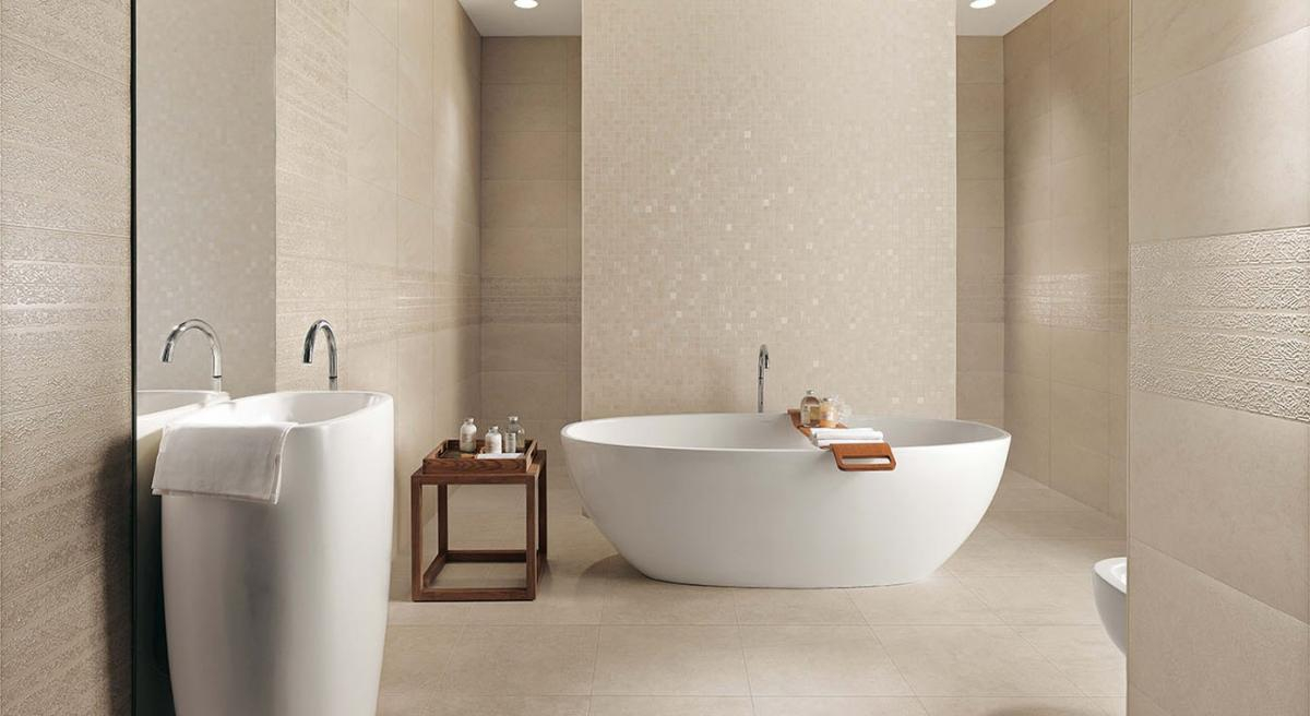 Architektonische Strenge, Stil und Persönlichkeit leben in der weißscherbigen Wandfliesenkollektion Desert. Ein Vorschlag für Badverkleidungsideen in mehreren Stilrichtungen mit aufeinander abgestimmten Fußböden aus Feinsteinzeug