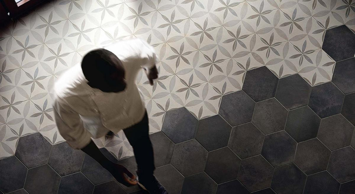 Die Sechsecke aus Feinsteinzeug interpretieren den Wert der Handwerkskunst der Handwerker vergangener Zeiten und die raffinierte Schlichtheit eines natürlichen Materials neu. Das ist Firenze, eine Kollektion von Bodenbelägen und Zementfliesen mit handwerklichem Flair, in raffinierten staubigen und natürlichen Nuancen und exklusiven Dekorationen.