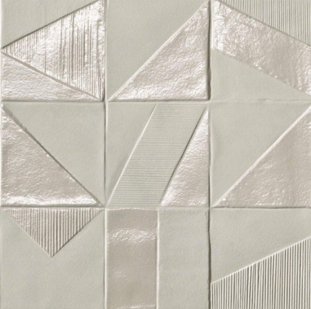 Eine einzigartige und originelle Kollektion für weißscherbige Wandfliesen, die mit der Kombination von glänzenden Oberflächen auf matten Hintergründen spielt und dynamische geometrische Spiele in Relief- und 3D-Effekten erzeugt