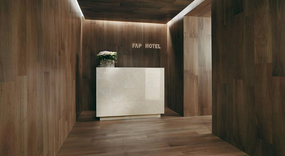 Das Licht spielt mit seinen warmen Fliesenoberflächen in Holzoptik und seinen authentischen Details aus natürlichen Streifen und geschwungenen Adern, die das Material beleben