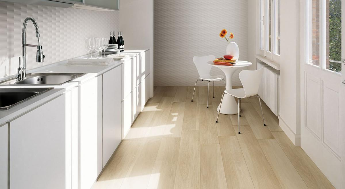 Das Licht spielt mit seinen warmen Fliesenoberflächen in Holzoptik und seinen authentischen Details aus natürlichen Streifen und geschwungenen Adern, die das Material beleben