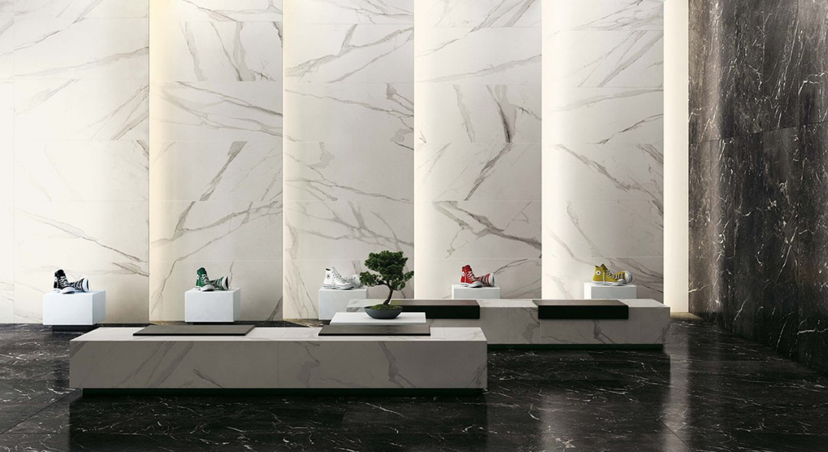 Roma ist die Kollektion von Fußböden aus Feinsteinzeug mit Marmoroptik und weißscherbigen Wandfliesen, die den umhüllenden Charme von Marmor und Stein in einem zeitgenössischen Ton neu interpretiert.