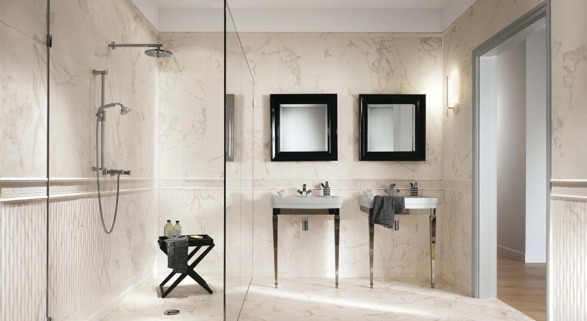 Roma ist die Kollektion von Fußböden aus Feinsteinzeug mit Marmoroptik und weißscherbigen Wandfliesen, die den umhüllenden Charme von Marmor und Stein in einem zeitgenössischen Ton neu interpretiert.