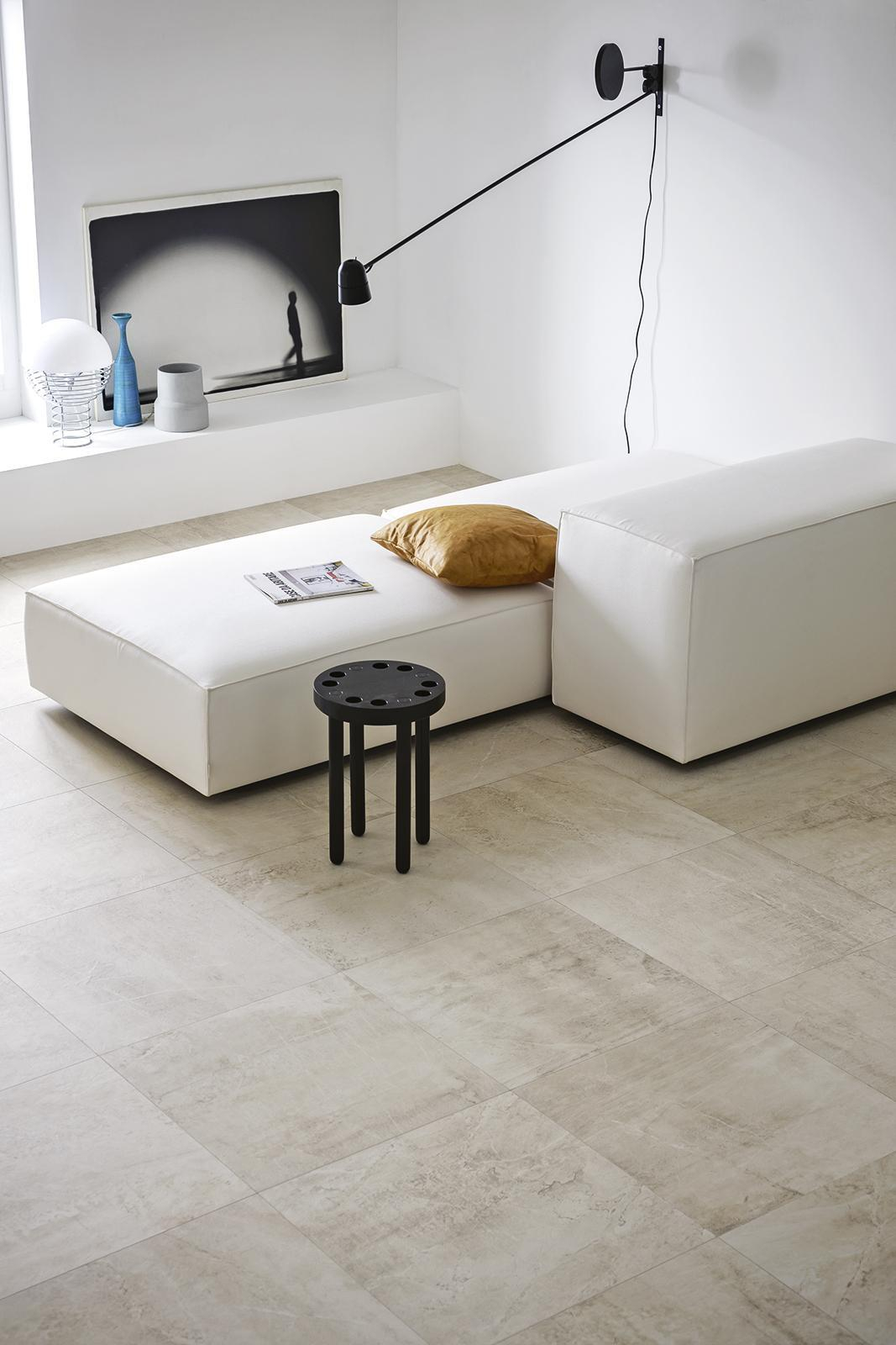 Blend ist von den Materialien alter Betonstrukturen inspiriert. Die Fliesen in Steinoptik sind in 4 Farben und 3 Größen mit satinierter Oberfläche erhältlich.