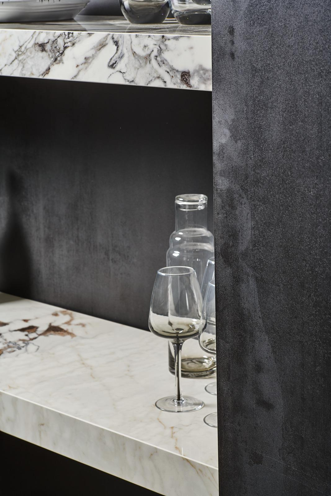 Der mineralische Charme von Metallen in drei Farben mit einer suggestiven schillernden Oberfläche, hervorgehoben durch große Platten, die die Möglichkeit des Entwerfens ohne Unterbrechungen der Kontinuität verstärken