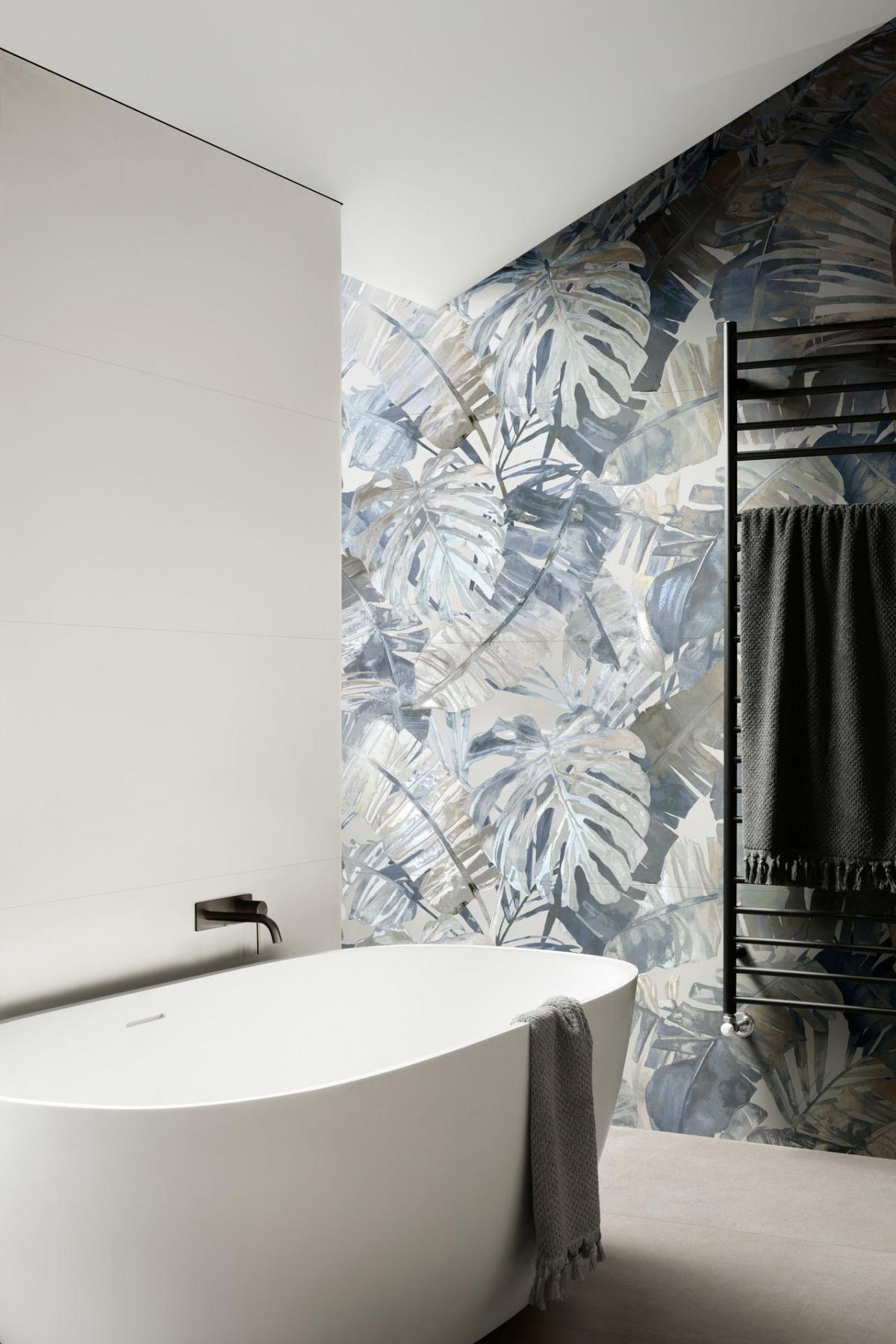 Verschiedene Sprachen und Stile treffen auf einer halbmatten, weichen und satinweißen Oberfläche aufeinander und erwecken das transversale und zeitlose geometrische Muster Vision und fesselnde Blumendekorationen zum Leben