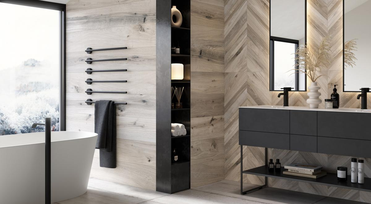 Rustikal bedeutet in diesem Fall nicht unraffiniert, obwohl dieser Holzeffekt den Hauch von Handwerkskunst mit sich bringt, ist er äußerst minimalistisch und elegant. In seinen vielen Formaten eignet sich dieses Feinsteinzeug perfekt für jede Art von Umgebung