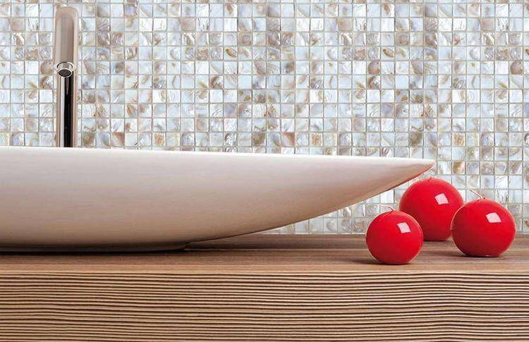 Bei den Mosaiken der PERLA-Serie handelt es sich um Produkte aus natürlichem Perlmutt, das mit handwerklichen Verfahren aus großen Muscheln gewonnen wird. Die Unregelmäßigkeiten in der Form der Fliesen sowie die kleinen Absplitterungen gelten als typische Merkmale eines natürlichen Perlmutts Produkt von Hand gefertigt.