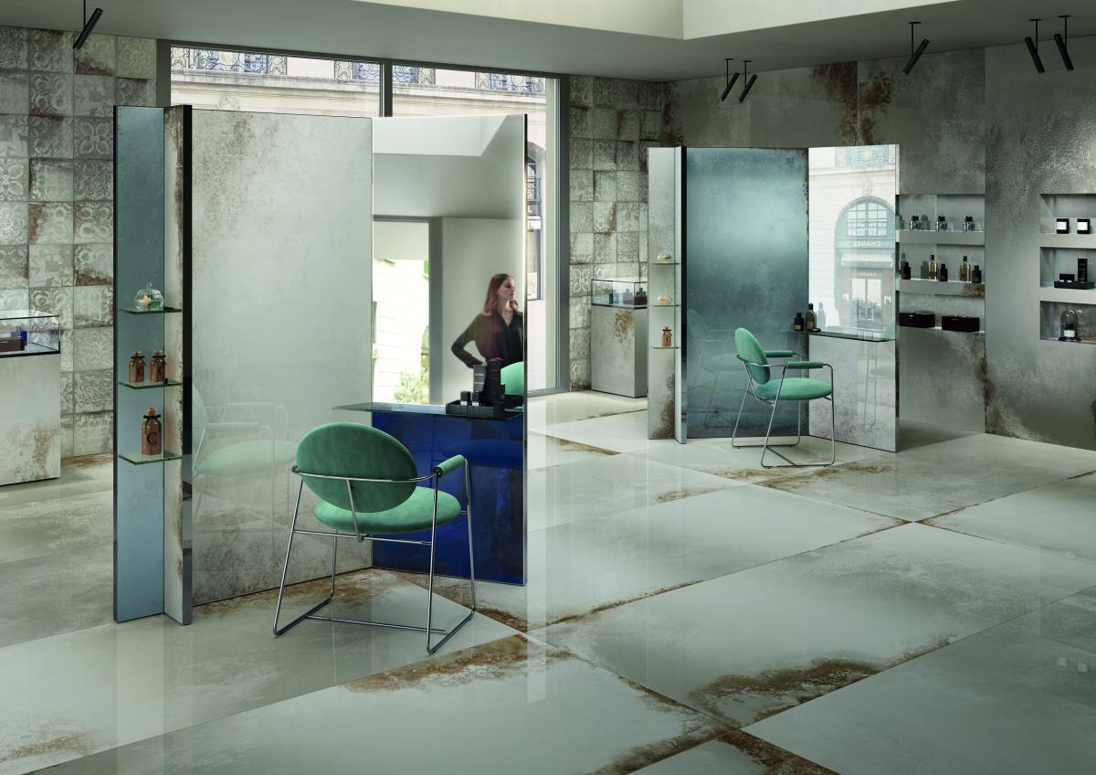 Neue Kollektion, inspiriert von den Oberflächen antiker Spiegel, die durch atmosphärische Einflüsse oxidiert und im Laufe der Zeit getrübt wurden. Bei Narciso sticht jedes Detail dank der glänzend geläppten und matt geläppten Oberflächen hervor, die die ursprünglichen ästhetischen und materiellen Effekte wiederherstellen. Mit vier Farben erhältlich: Perle, Silber, Topas und Saphir. Diese Kollektion schafft einen idealen Effekt für öffentliche und private Umgebungen mit großer visueller Wirkung. Die Effekte, die durch das Spiel des Lichts mit den Oberflächen entstehen und durch die Reflexionen verstärkt werden, die die Kollektion hervorruft. Fragmente-Dekore aus Spiegelsplittern, die harmonisch auf der Oberfläche angeordnet sind, und das Gemma-Dekor mit antiken Effekten und stilisierten Dekorationen fügen der Kollektion weitere Stilreflexe hinzu.
