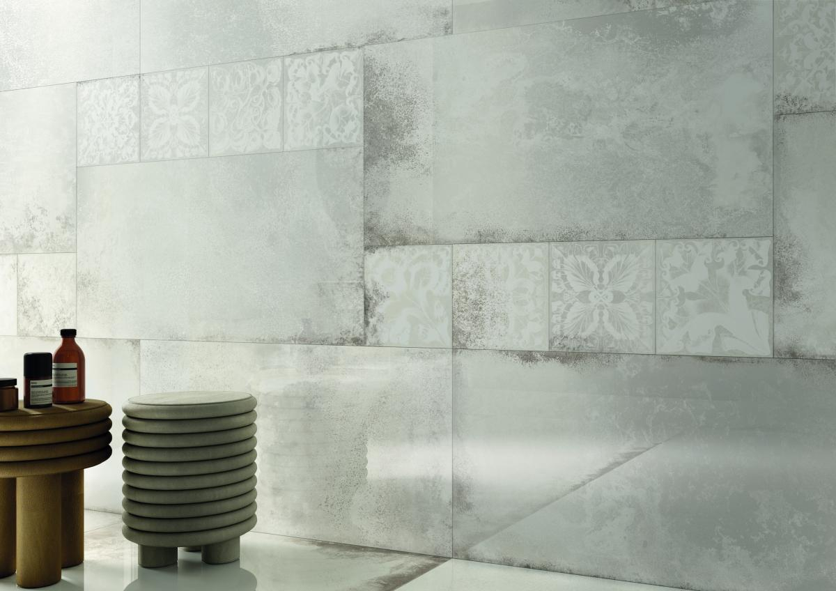 Neue Kollektion, inspiriert von den Oberflächen antiker Spiegel, die durch atmosphärische Einflüsse oxidiert und im Laufe der Zeit getrübt wurden. Bei Narciso sticht jedes Detail dank der glänzend geläppten und matt geläppten Oberflächen hervor, die die ursprünglichen ästhetischen und materiellen Effekte wiederherstellen. Mit vier Farben erhältlich: Perle, Silber, Topas und Saphir. Diese Kollektion schafft einen idealen Effekt für öffentliche und private Umgebungen mit großer visueller Wirkung. Die Effekte, die durch das Spiel des Lichts mit den Oberflächen entstehen und durch die Reflexionen verstärkt werden, die die Kollektion hervorruft. Fragmente-Dekore aus Spiegelsplittern, die harmonisch auf der Oberfläche angeordnet sind, und das Gemma-Dekor mit antiken Effekten und stilisierten Dekorationen fügen der Kollektion weitere Stilreflexe hinzu.