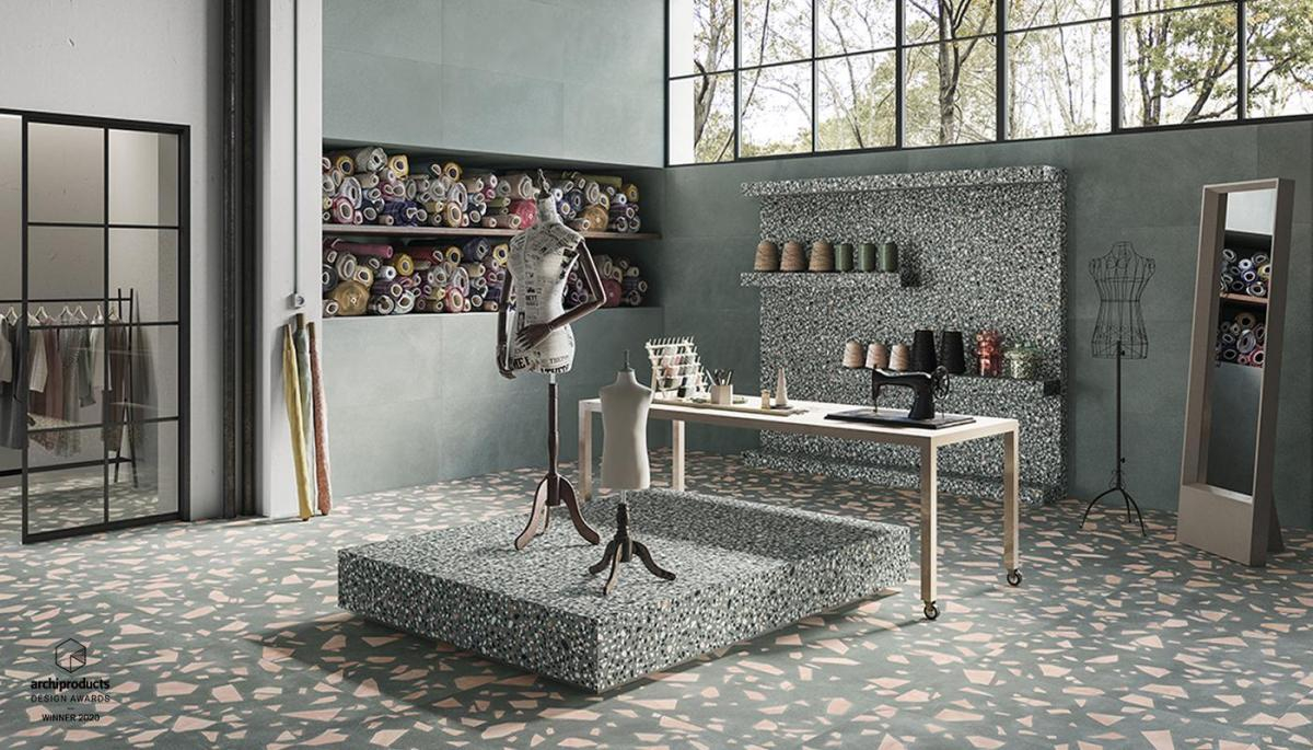 An abacus of ceramic materials designed for architectural design and experimentation. The collection is made up of two variants of concrete, Minimal and Tecnica, to which are added 3 terrazzo tiles